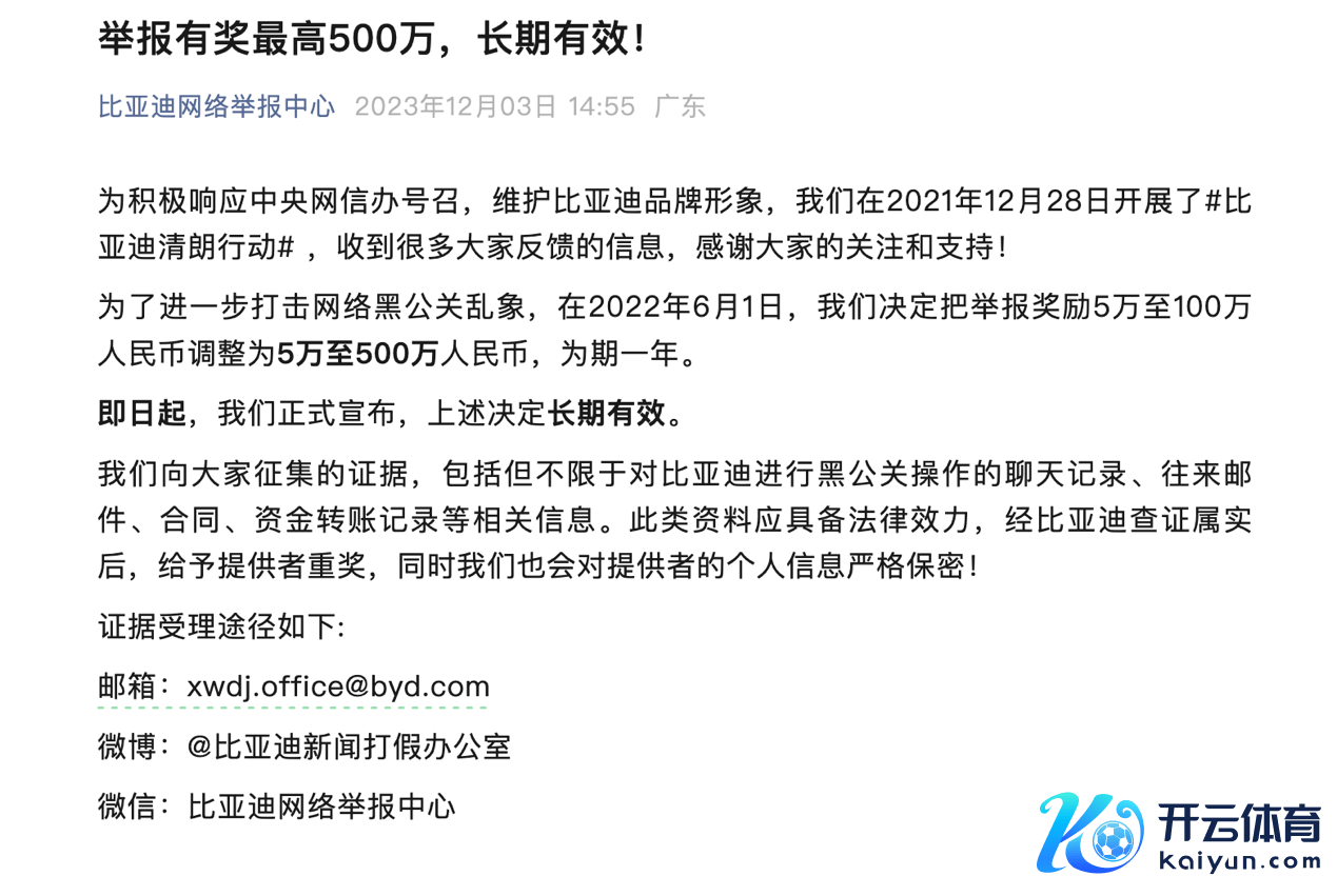 因此,李云飞敕令有正义感的媒体东谈主积极提供黑公关和黑媒体的谈判凭据和痕迹。早在2021年,比亚迪就曾推出晴朗活动赏格5-100万打击黑公关。尔后,2022年6月将奖金擢升到5-500万元,况且是恒久灵验。