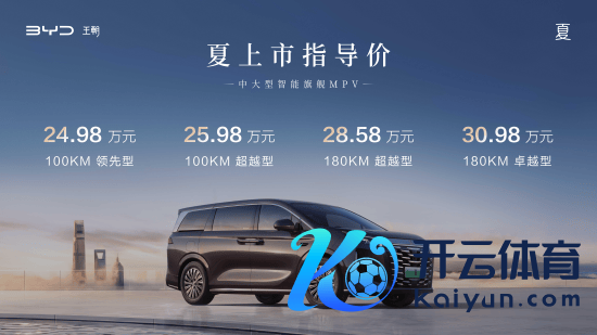新浪科技讯 1月8日晚间音书,中大型智能旗舰MPV比亚迪夏当天负责上市,共有4款成就,分为CLTC工况续航100km/180km,2种纯电续航版块。并提供4种外不雅心绪及2种内饰配色可选,售价为24.98-30.98万元。