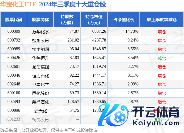 华宝化工ETF为指数型-股票基金,阐述最新一期基金季报显现,该基金金钱确立:股票占净值比99.04%,无债券类金钱,现款占净值比1.13%。基金十大重仓股如下: