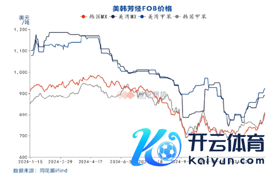 由于汽油裂差偏低,调油商对调油组分的备货积极性也有所放缓,导致好意思国的汽油调理组分库存偏低,直至2024年11月份才初始逐渐回升。随后,好意思国芳烃价钱执续高潮,好意思韩芳烃价差也从低位回升。自12月中旬就传出亚洲商业商准备向好意思国出口芳烃的音信,同期亚洲汽油价钱走强,亚洲芳烃价钱执续高潮。