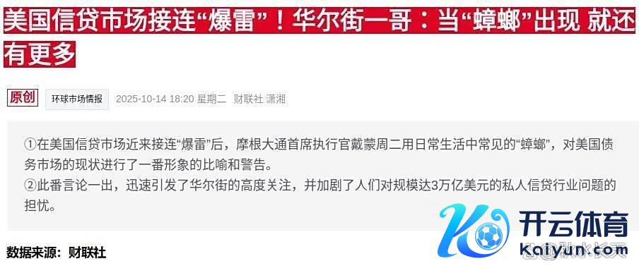 摩根大通CEO戴蒙最近的一番话让我念念起了2015年的A股市集。他用"蟑螂表面"形容现时的好意思国信贷市集风险:"当看到一只蟑螂时开云官网切尔西赞助商,继续意味着还有更多蟑螂存在。"这番话激发华尔街对范围达3万亿好意思元的私东谈主信贷市集的深度担忧。