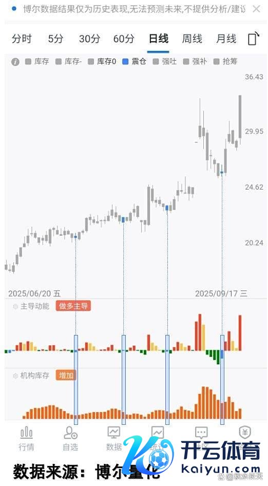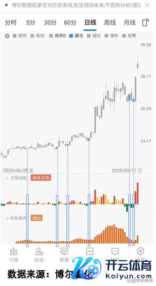 第二组由橙色柱体组成的「机构库存」数据响应的是机构大资金的活跃过程橙色柱体捏续的时候越长阐发机构资金参与交往的积极性越高淌若机构大资金不看好一只股票是不可能一直参与交往的。